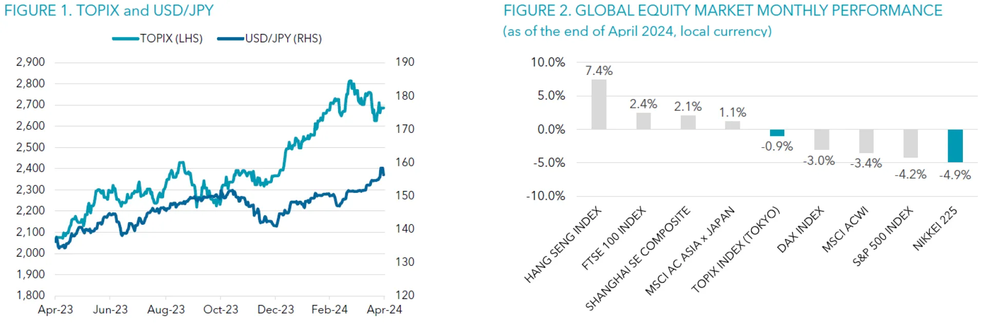 In April the Japanese TOPIX and Nikkei 225 indices faced declines, primarily driven by the downturn in U.S. semiconductor stocks and escalating tensions in the Middle East. In particular, the Nikkei 225 experienced a significant drop mid-month, although by the end of the month it had begun to recover as foreign investors increased their cash stock purchases, alongside active retail investor participation. Although the yen's rapid depreciation against the U.S. dollar benefits export stocks, it is speculated that Japan's Ministry of Finance intervened in the currency market. Meanwhile at this month's Monetary Policy Meeting the BOJ announced their intention to maintain the status quo in terms of monetary policy.